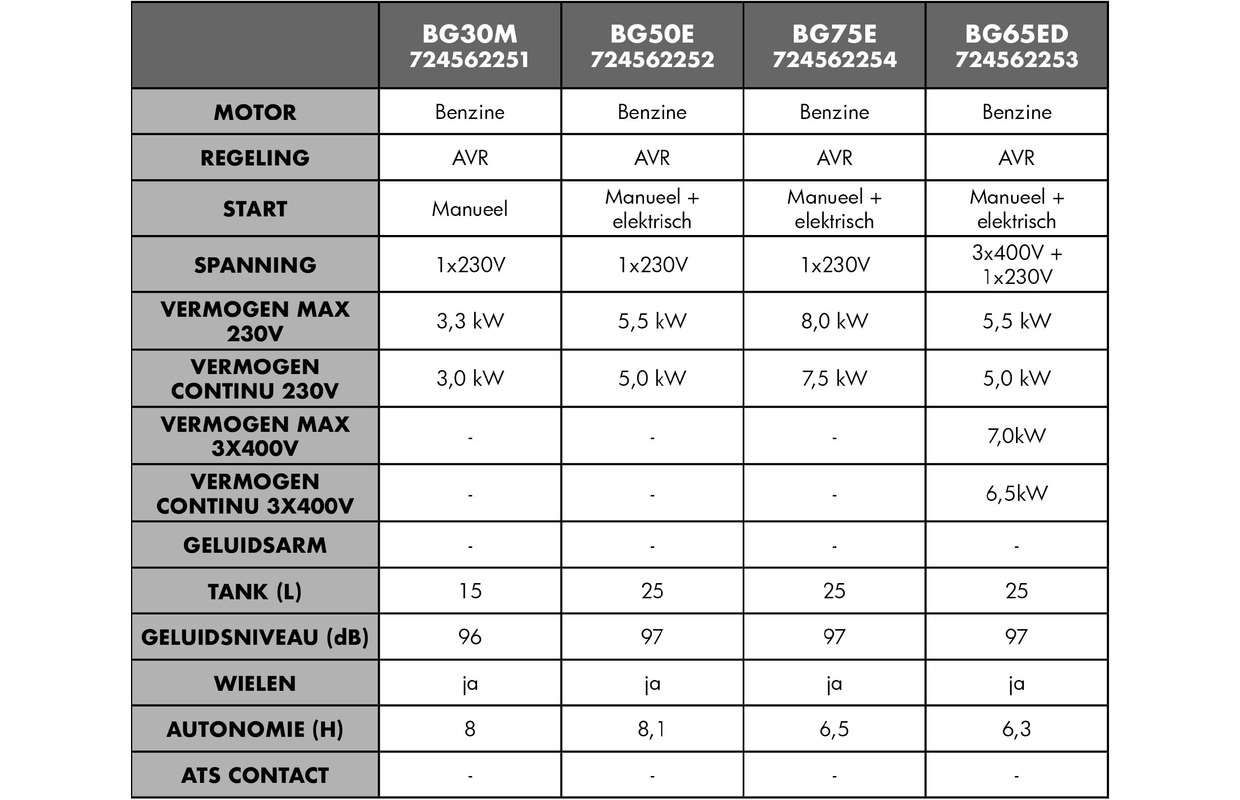 Wilt u elektromotoren laten draaien met een generator, hou dan rekening met de opstartpiek die deze machines vragen van de generator. Bijvoorbeeld: waterpompen, slijpmachines, compressoren, etc. Bij een niet belaste rotor ligt de opstartpiek 2-3 x hoger dan de stroom, en bij belaste rotor ligt deze 5-8 x hoger. Hierbij is het dus van belang om de generator voldoende over te dimensioneren.