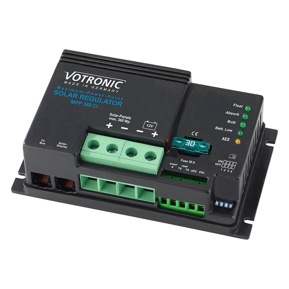 Votronic levert hoogwaardige MPP-zonne-energiebesturingen voor campers, caravans en boten. De zonnecontrollers van de serie "MPP" (maximaal stroompunt) met de oplaadkarakteristieken "IU1oU2" zijn aangesloten als een verbinding tussen zonnepanelen en batterij(en). In de MPP-technologie bepaalt de controller meerdere keren per seconde automatisch de maximale prestatieopbrengst (MPP) van de zonnepanelen. Het transformeert vervolgens het voltageoverschot van de zonnemodule in een hogere laadstroom voor de batterij (gerealiseerd door hoogfrequente schakelmechanismetechnologie met hoge efficiëntie). Deze oplaadstroomwinst zorgt voor kortere laadtijden en het best mogelijke gebruik van de prestaties van het zonnesysteem. De MPP-zonnecontrollers werken volledig automatisch.